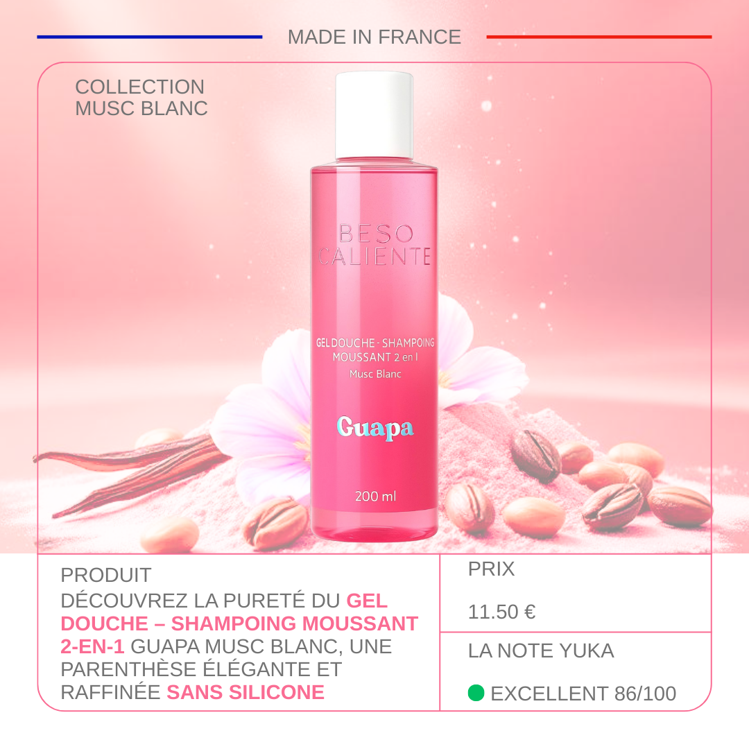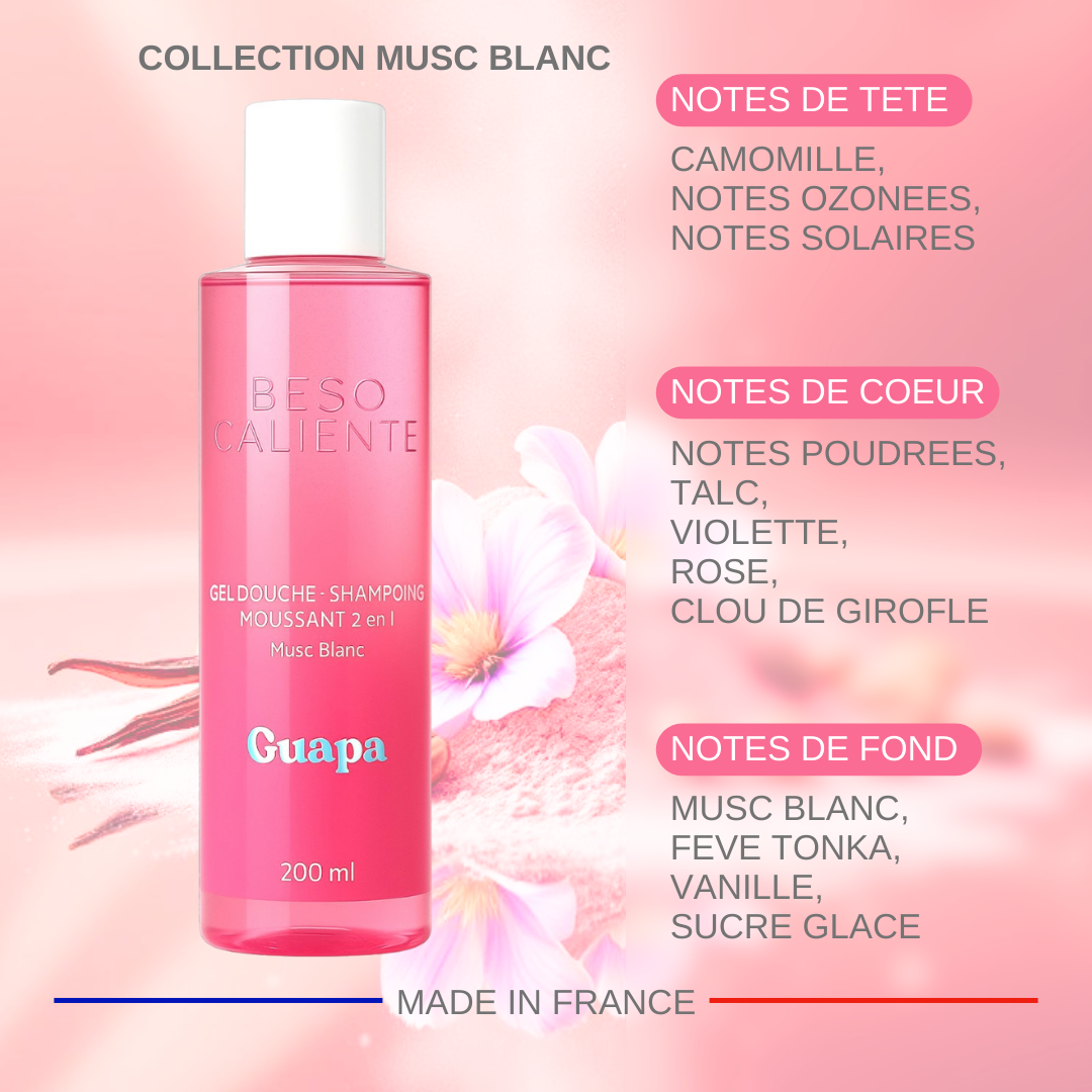 Découvrez la douceur et la pureté du gel douche – shampoing 2-en-1 GUAPA Musc Blanc, une parenthèse élégante et raffinée pour le corps et les cheveux.