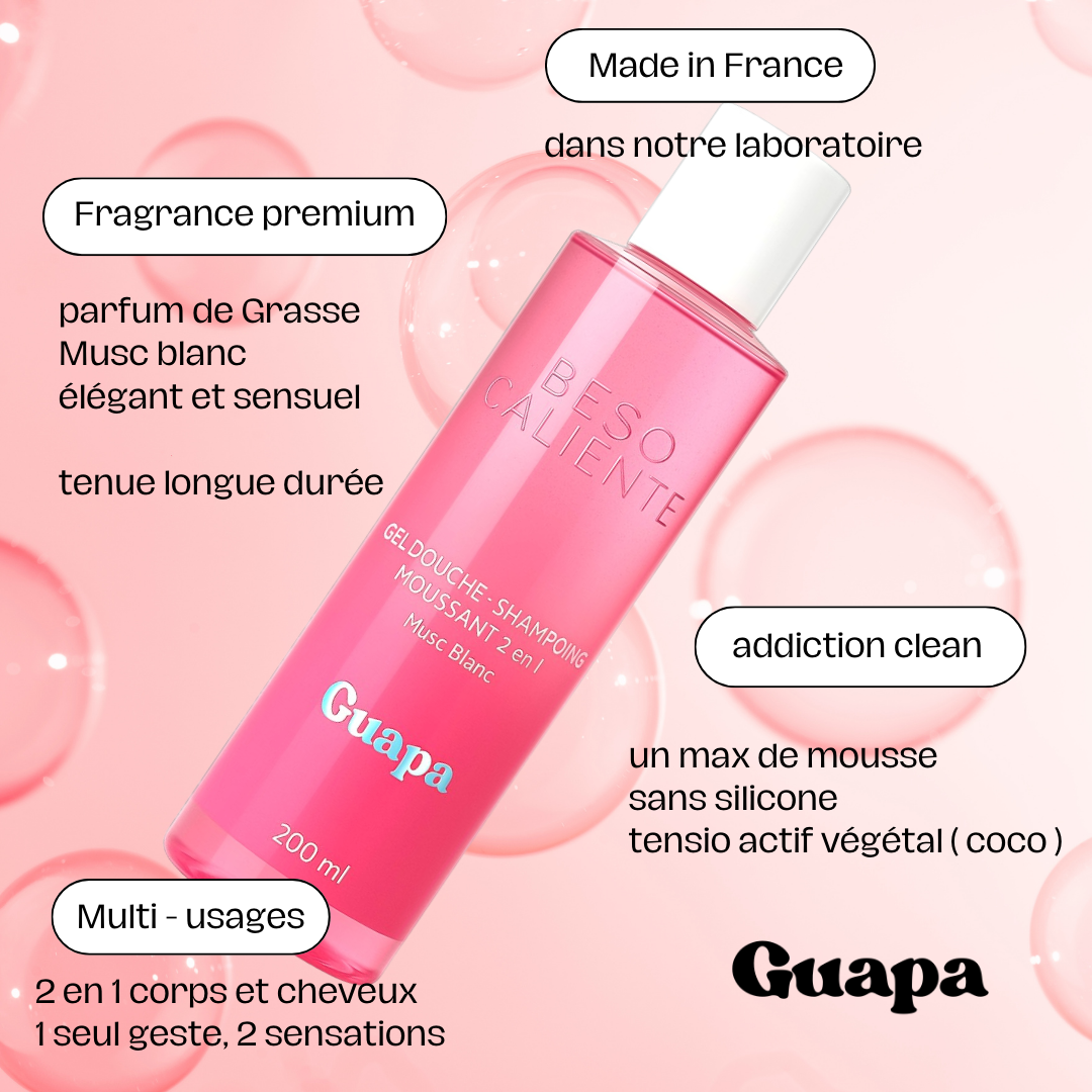 Formulé en France, clean, végan et adapté à tous types de peaux et de cheveux, le gel douche Beso Caliente révèle la féminité douce et élégante qui caractérise GUAPA