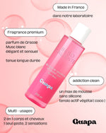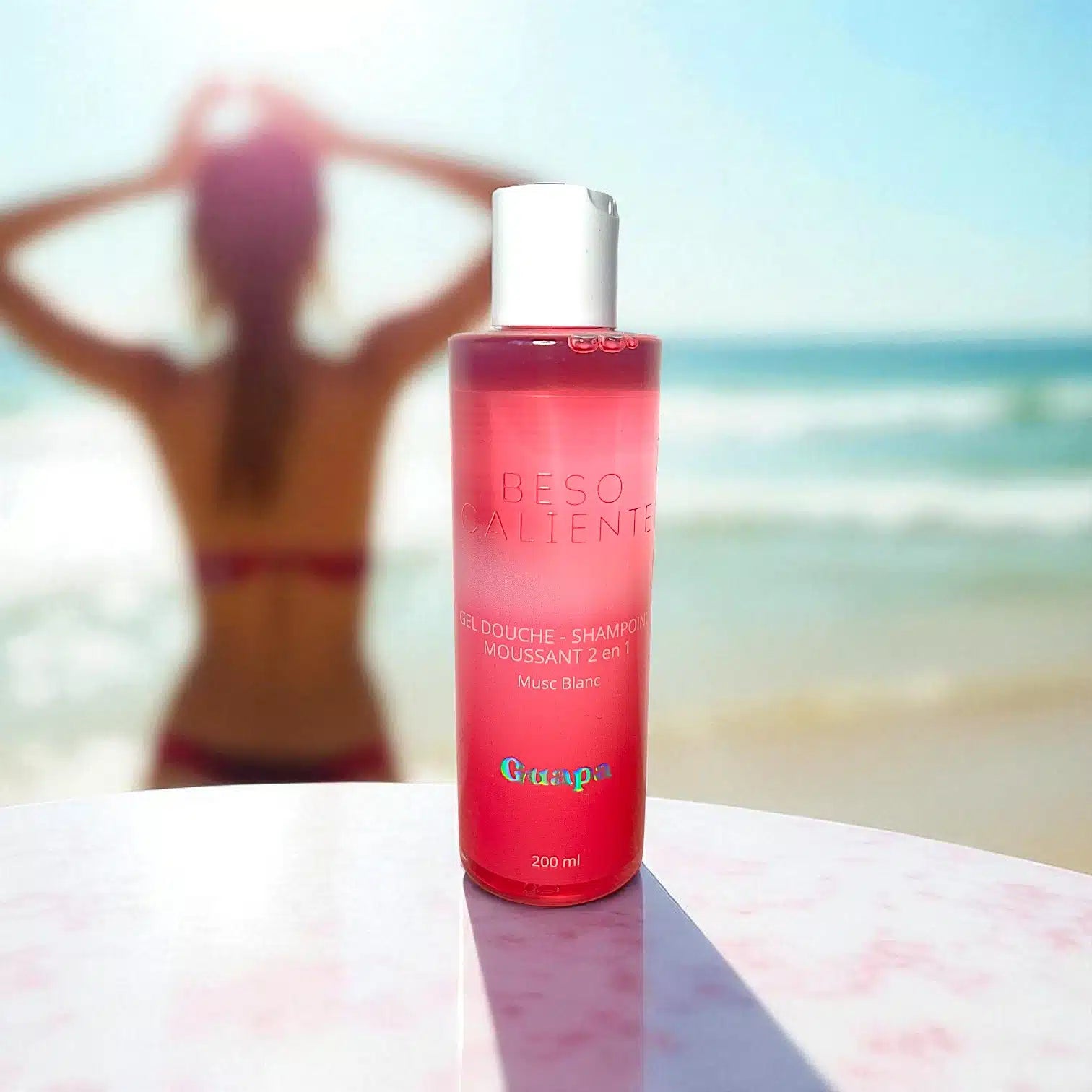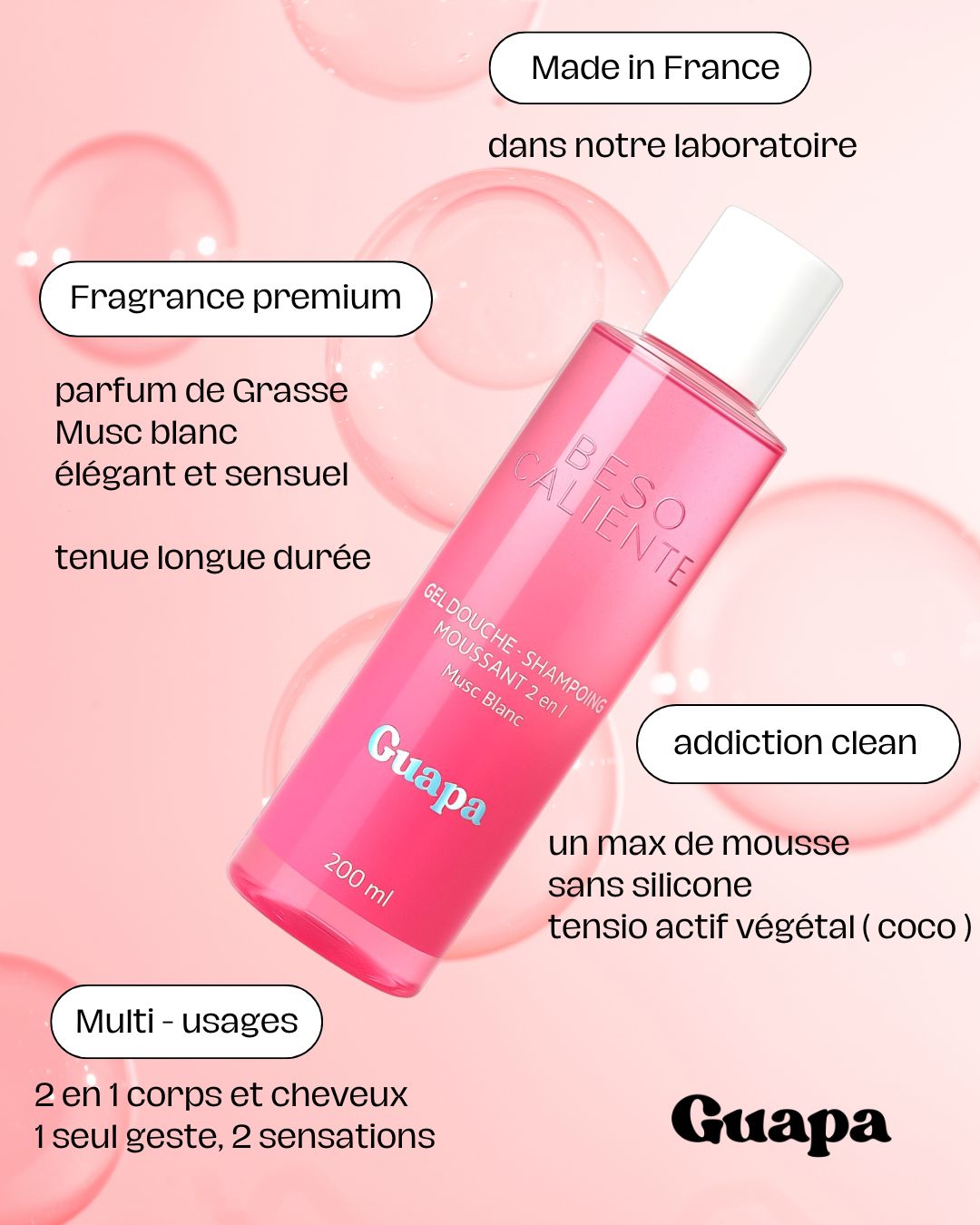 Formulé en France, clean, végan et adapté à tous types de peaux et de cheveux, le gel douche Beso Caliente révèle la féminité douce et élégante qui caractérise GUAPA