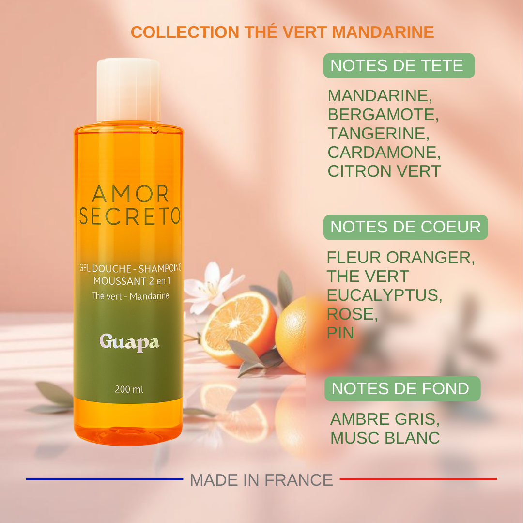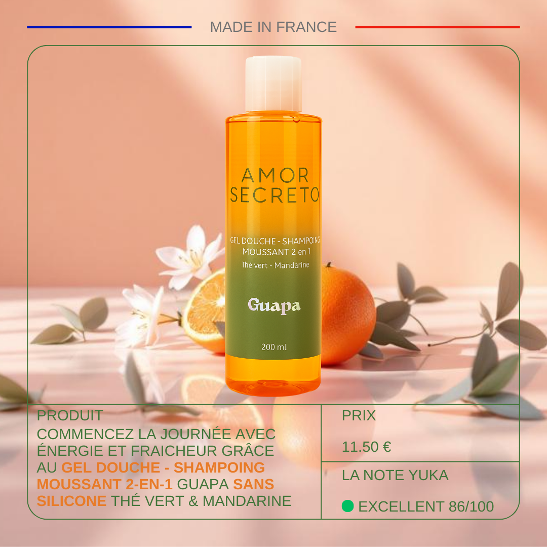 Commencez la journée avec une vague d’énergie grâce au gel douche - shampoing 2-en-1 GUAPA Thé Vert / Mandarine.