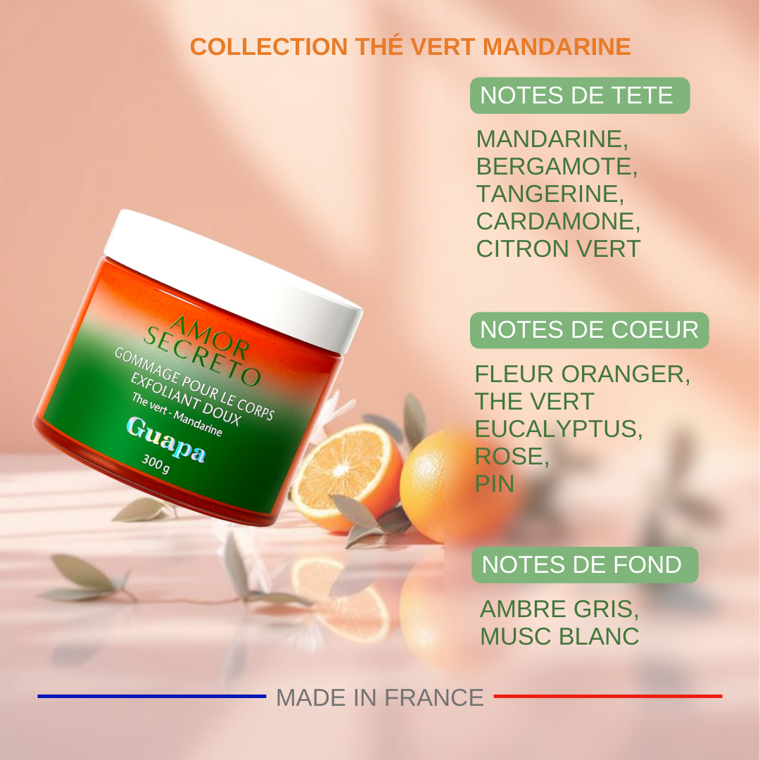 Offrez à votre peau un souffle de fraîcheur vivifiant avec le gommage exfoliant GUAPA Thé Vert / Mandarine, un soin doux et énergisant qui réveille l’éclat naturel du corps.