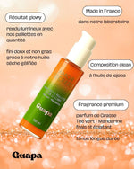 Réveillez votre éclat naturel avec l’huile sèche pailletée GUAPA Thé Vert et  Mandarine, une fragrance pétillante qui mêle fraîcheur et vitalité solaire.