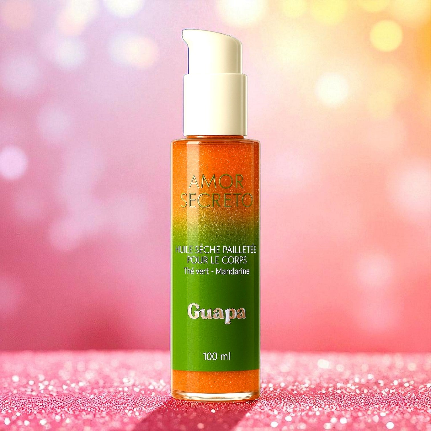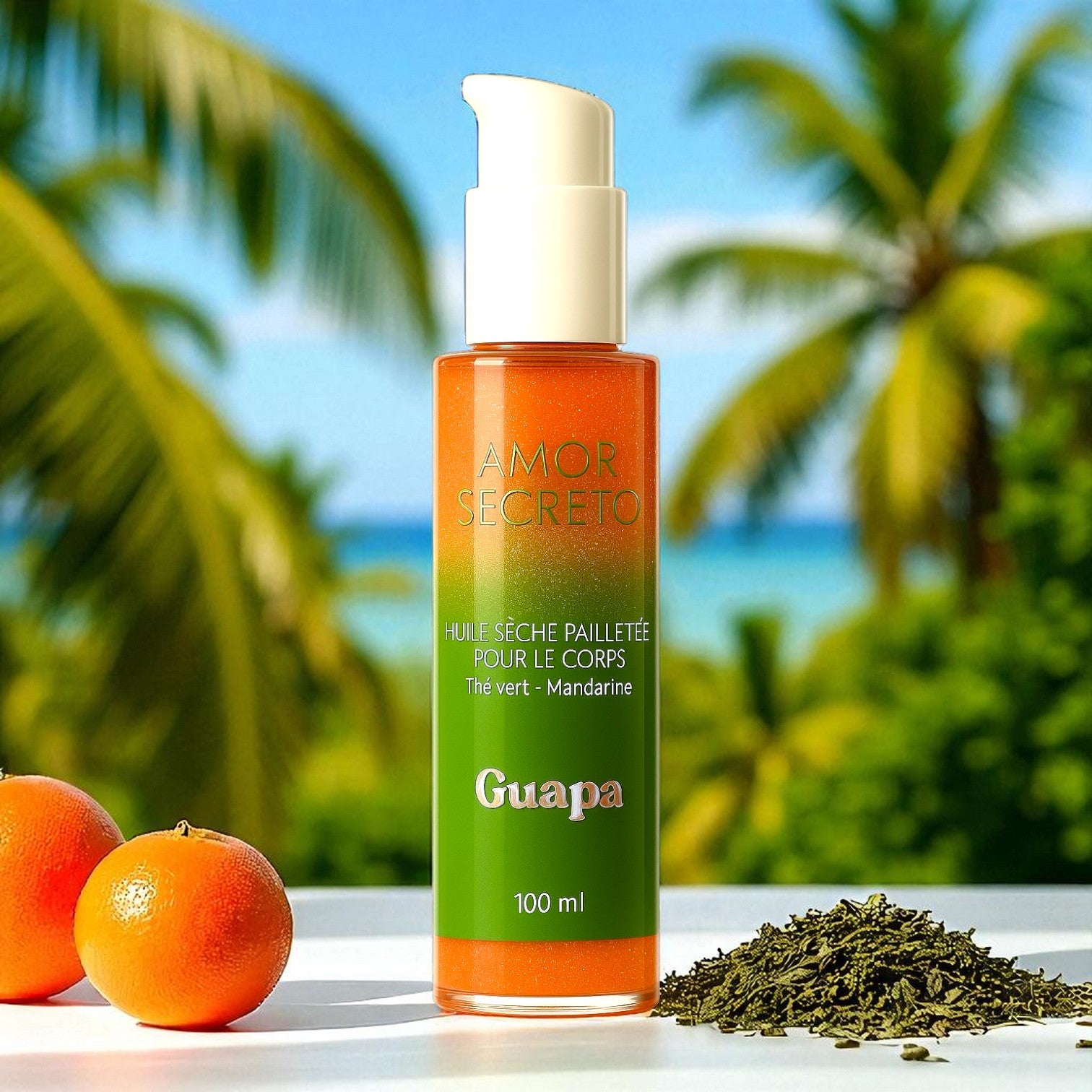 💚 GUAPA Thé Vert / Mandarine, l’huile scintillante qui revitalise la peau et fait rayonner la féminité avec éclat et légèreté.
